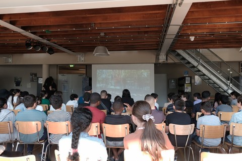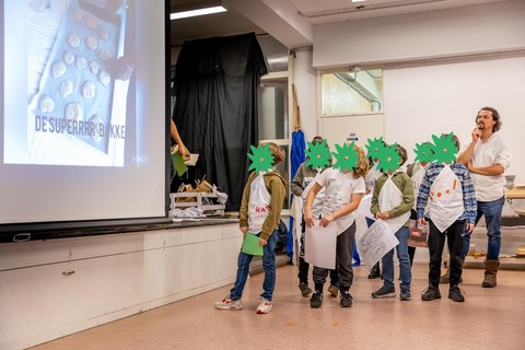 Yannis projecteert een filmpje op de muur. Het laat zien hoe de bakkers in Amersfoort een oeroude oven hebben gerestaureerd. De kinderen zijn gefascineerd en nieuwsgierig. ‘Waarom gaan de stenen niet kapot van het vuur?’ ‘Waarom ziet de oven eruit als een ijsbeerhuis?’ ‘Goede vragen,’ zegt Peik, en hij legt uit dat de stenen hittebestendig zijn en dat een koepelvorm ijzersterk is. ‘Net als een brug, die is ook altijd een beetje bol.’