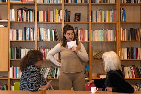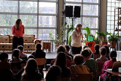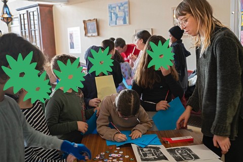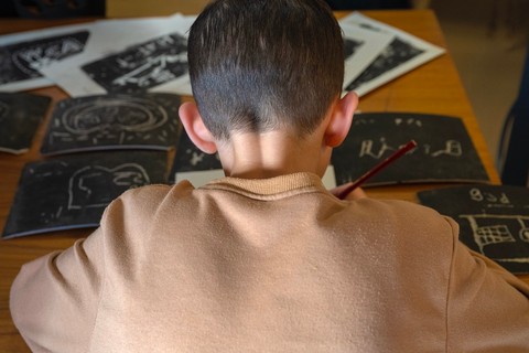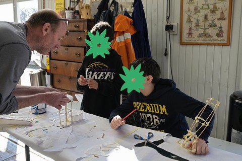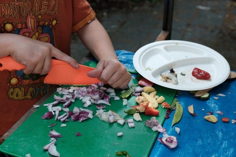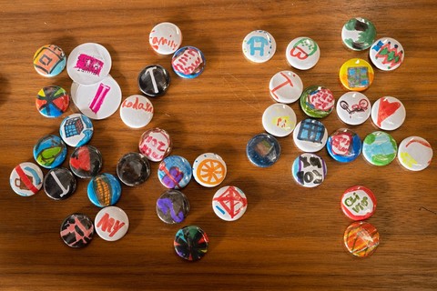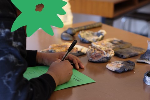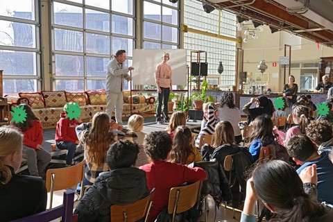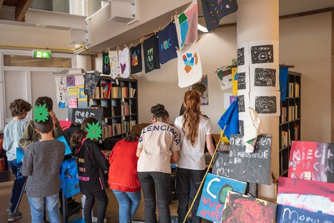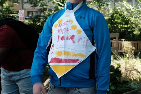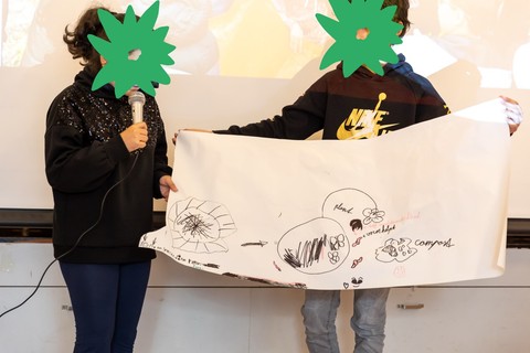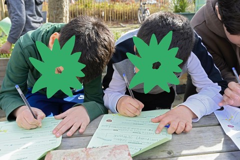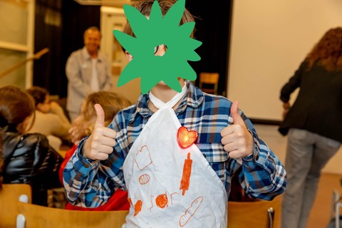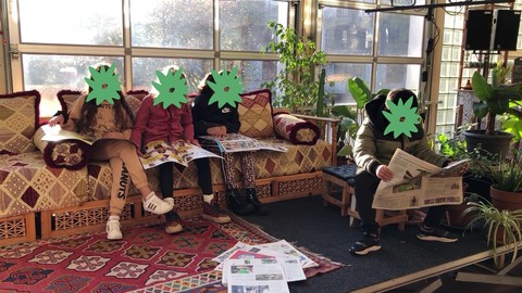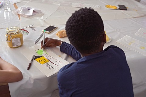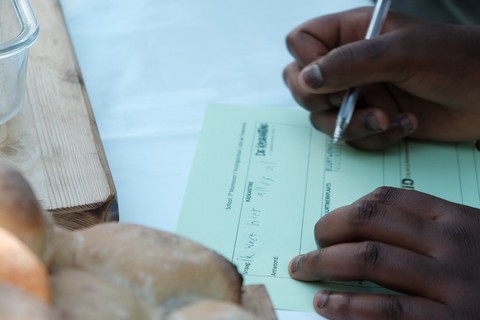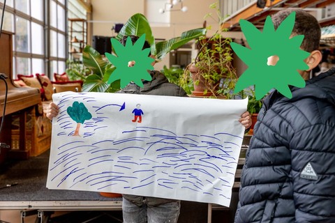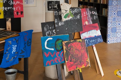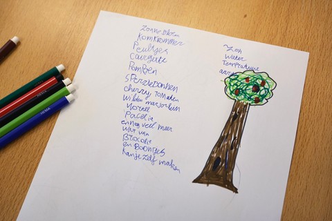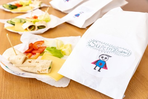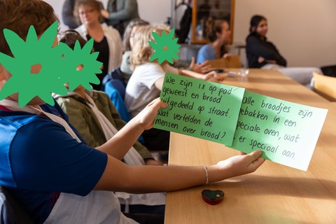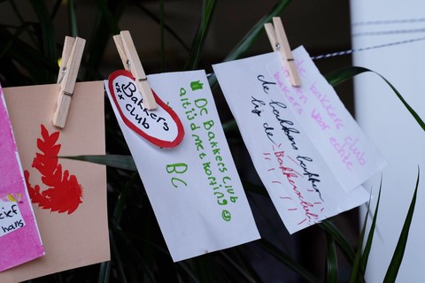 Voor de kinderen in hun schriftjes schrijven wat ze vandaag hebben gedaan, geeft Peik hen nog één opdracht. Hij vraagt hen op een broodzakje van de Bakkerij te schrijven hoe je van niets iets kunt maken, hoe je plezier kunt hebben met simpele dingen die niets kosten. ‘Eigenlijk wil ik hen laten nadenken over eenvoud,’ zegt hij later, ‘maar dat is te abstract.’ ‘Vrienden of vriendinnen kun je alles mee,’ schrijft Maroua. Miquel tekent een boomhut. Aya moet een beetje geholpen worden met het woord recyclen. Fiorella heeft opgeschreven dat ze met haar zusje een chill lounge heeft gebouwd van kussens en dekens. Sara schrijft: brood bakken.