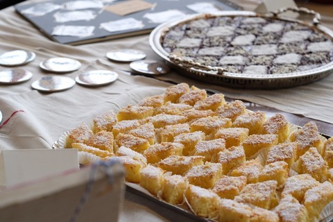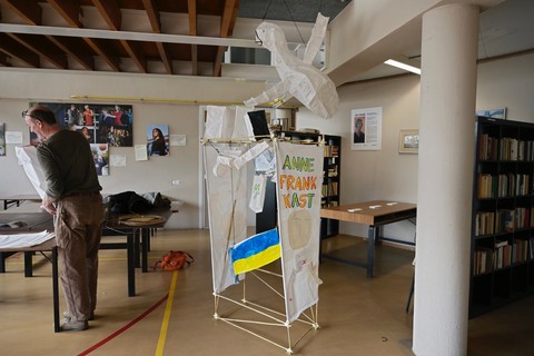 Binnen ruikt het al lekker. Peter heeft de Palestijnse broodjes uit de oven gehaald en de grote broden erin geschoven. De kinderen beleggen de baksels met honing of kaas of allebei; de stapel slinkt snel. Ondertussen vervolmaken ze de versiering van hun schortjes. Rimas heeft al een flat, de zon en schommels erop en kleurt nu een Palestijnse vlag verder in. Tot haar verbazing lijkt die precies op de Soedanese vlag op het schortje van haar buurvrouw Intisar. Het is een vredig kwartiertje.