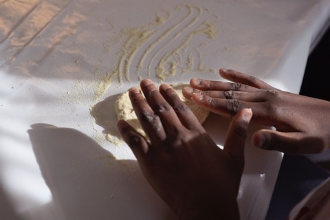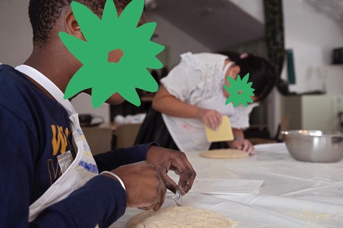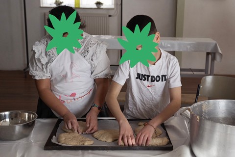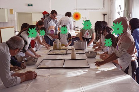De pitabroodjes heten inmiddels Palestijnse broodjes: Rimas herkende ze als iets wat ook in haar geboorteland wordt gegeten. Als het deeg klaar is – pitadeeg hoeft niet te rijzen – laat Yannis zien hoe je er broodjes van maakt. Bolletje rollen, anti-plak griesmeel eroverheen, platduwen, paar keer omkeren en weer platduwen. Er wordt verwoed gekneed en geduwd. Aya maakt een hartje, Laila een donut, Fiorella piepkleine broodjes, eentje ter grootte van een nagel. ‘Dit zijn mijn broodbaby’s. Mogen die ook in de oven?’ Dat mag. Peter schuift de volle bakplaten in de oven.