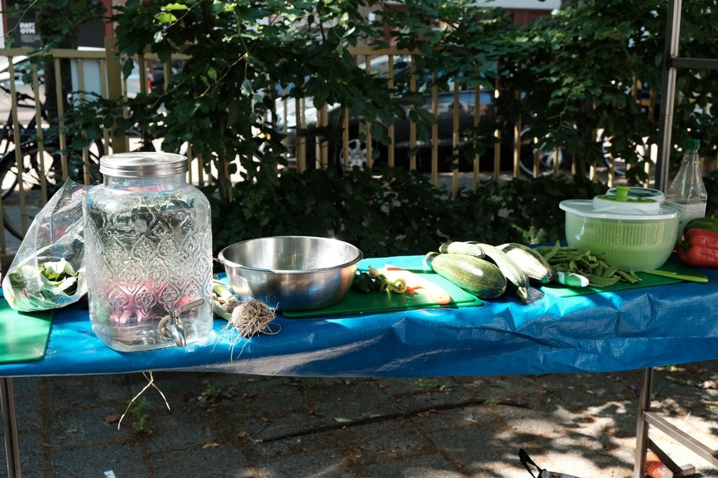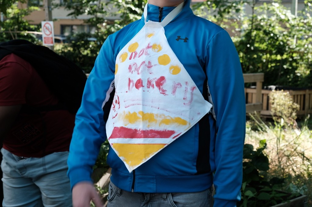 Binnen ruikt het al lekker. Peter heeft de Palestijnse broodjes uit de oven gehaald en de grote broden erin geschoven. De kinderen beleggen de baksels met honing of kaas of allebei; de stapel slinkt snel. Ondertussen vervolmaken ze de versiering van hun schortjes. Rimas heeft al een flat, de zon en schommels erop en kleurt nu een Palestijnse vlag verder in. Tot haar verbazing lijkt die precies op de Soedanese vlag op het schortje van haar buurvrouw Intisar. Het is een vredig kwartiertje.