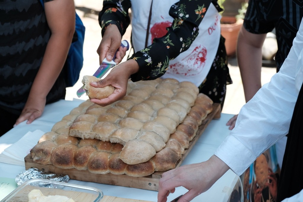 De pitabroodjes heten inmiddels Palestijnse broodjes: Rimas herkende ze als iets wat ook in haar geboorteland wordt gegeten. Als het deeg klaar is – pitadeeg hoeft niet te rijzen – laat Yannis zien hoe je er broodjes van maakt. Bolletje rollen, anti-plak griesmeel eroverheen, platduwen, paar keer omkeren en weer platduwen. Er wordt verwoed gekneed en geduwd. Aya maakt een hartje, Laila een donut, Fiorella piepkleine broodjes, eentje ter grootte van een nagel. ‘Dit zijn mijn broodbaby’s. Mogen die ook in de oven?’ Dat mag. Peter schuift de volle bakplaten in de oven.