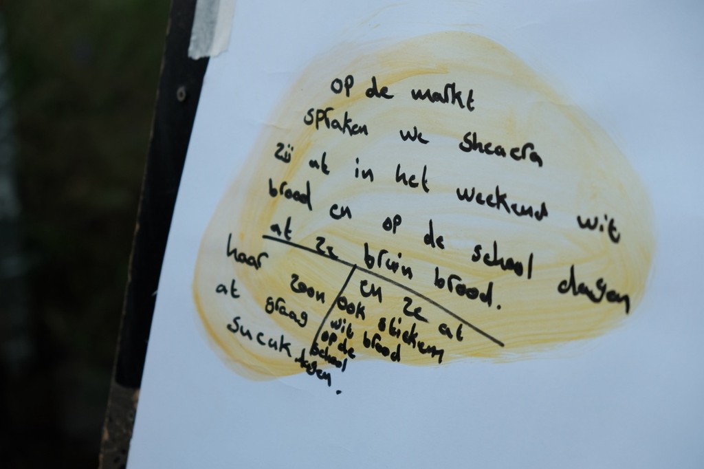 Voor de kinderen in hun schriftjes schrijven wat ze vandaag hebben gedaan, geeft Peik hen nog één opdracht. Hij vraagt hen op een broodzakje van de Bakkerij te schrijven hoe je van niets iets kunt maken, hoe je plezier kunt hebben met simpele dingen die niets kosten. ‘Eigenlijk wil ik hen laten nadenken over eenvoud,’ zegt hij later, ‘maar dat is te abstract.’ ‘Vrienden of vriendinnen kun je alles mee,’ schrijft Maroua. Miquel tekent een boomhut. Aya moet een beetje geholpen worden met het woord recyclen. Fiorella heeft opgeschreven dat ze met haar zusje een chill lounge heeft gebouwd van kussens en dekens. Sara schrijft: brood bakken.