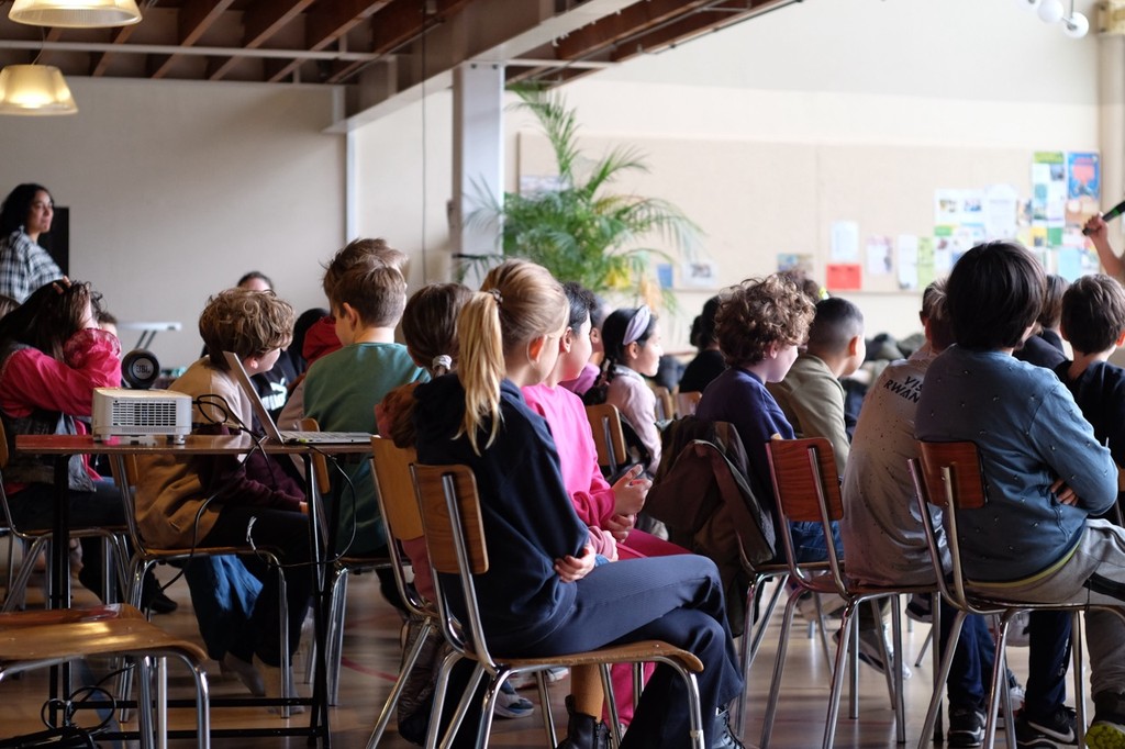 Yannis projecteert een filmpje op de muur. Het laat zien hoe de bakkers in Amersfoort een oeroude oven hebben gerestaureerd. De kinderen zijn gefascineerd en nieuwsgierig. ‘Waarom gaan de stenen niet kapot van het vuur?’ ‘Waarom ziet de oven eruit als een ijsbeerhuis?’ ‘Goede vragen,’ zegt Peik, en hij legt uit dat de stenen hittebestendig zijn en dat een koepelvorm ijzersterk is. ‘Net als een brug, die is ook altijd een beetje bol.’