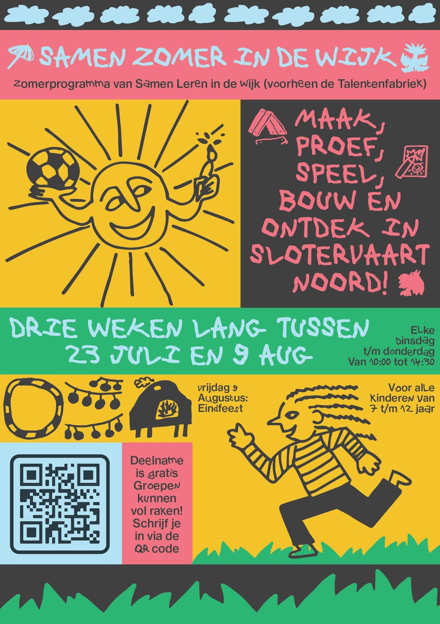 Een vakantieprogramma (onderdeel van Midzomer Mokum) waar kinderen aan verschillende talentontwikkelingsactiviteiten kunnen meedoen. Deze worden uitgevoerd door bewoners en professionals uit de wijk. Kinderen maken kennis met verschillende vormen van kunst-, cultuur-, natuur- en sportactiviteiten op verschillende locaties in de wijk.Vrijdag 9 Augustus: Eindfeest