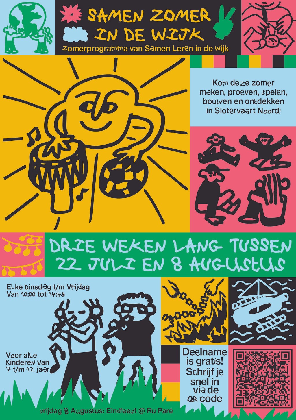 Van dinsdag 22 juli tot en met vrijdag 8 augustus kun je meedoen met het programma van Samen Zomer in de Wijk in Slotervaart. Een verveelmachine bouwen, kickboksen, theater maken of Djembé leren spelen? Deze zomer kan het allemaal!